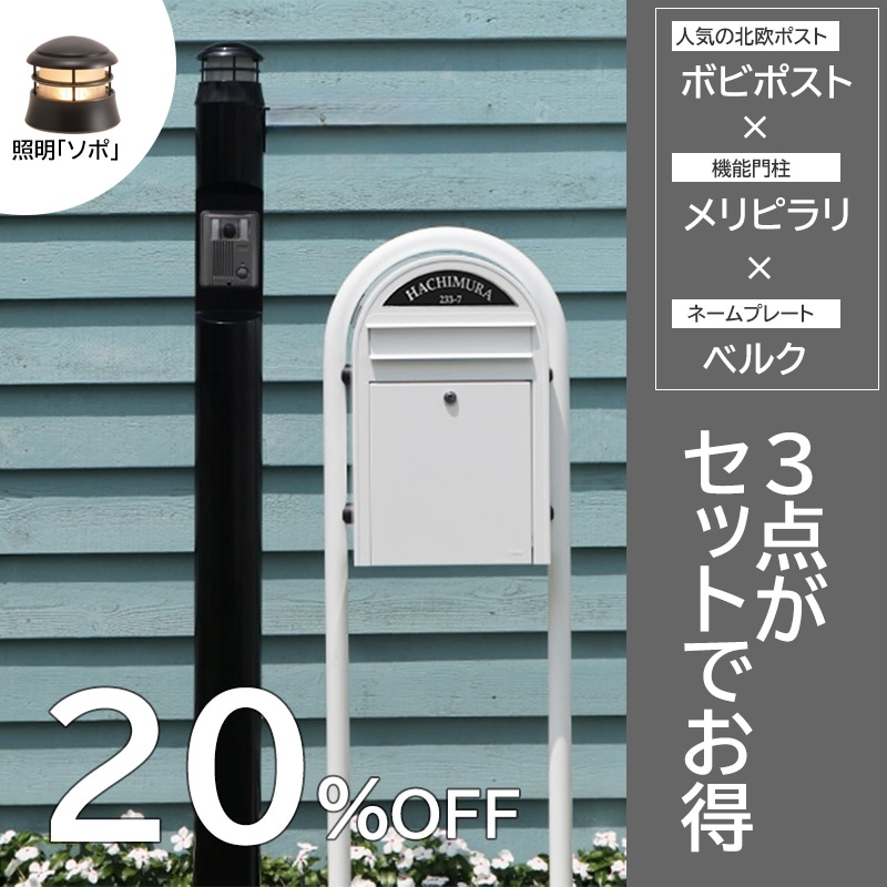 【20%OFF】北欧ボビ&機能門柱&表札の3点セット|bobiポスト(ポール付き)+メリピラリ機能門柱+ソポ照明+簡単設置ベルク表札|新築戸建てに人気の北欧デザイン