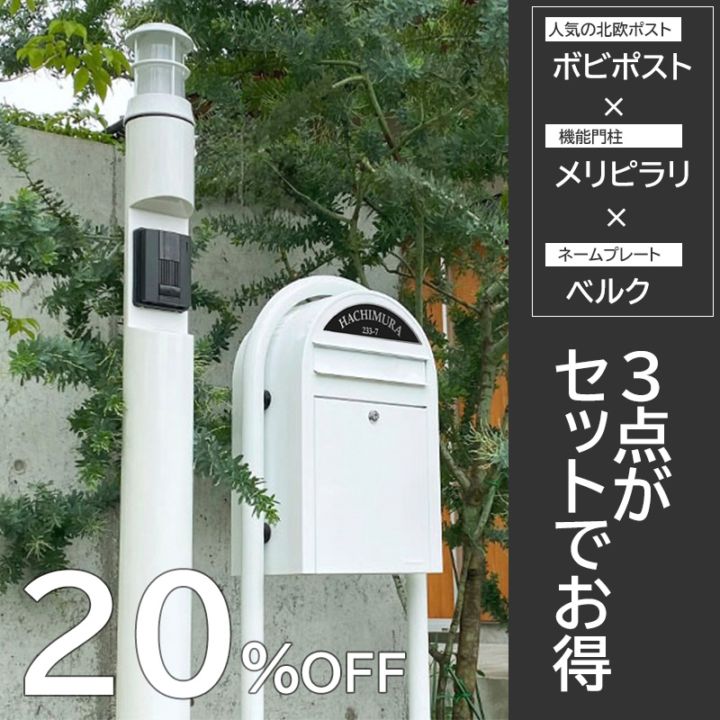 【20%OFF】北欧ボビ&機能門柱&表札の3点セット|bobiポスト(ポール付き)+メリピラリ機能門柱+バロ照明+簡単設置ベルク表札|新築戸建てに人気の北欧デザイン