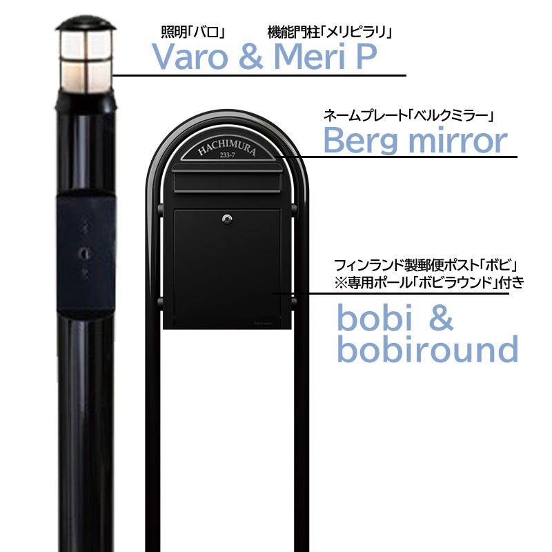 北欧ポストの定番 bobi と、北欧の海原にある灯台をイメージした門柱“メリピラリ”。そしてボビポストのために生まれたネームプレート”ベルク”。