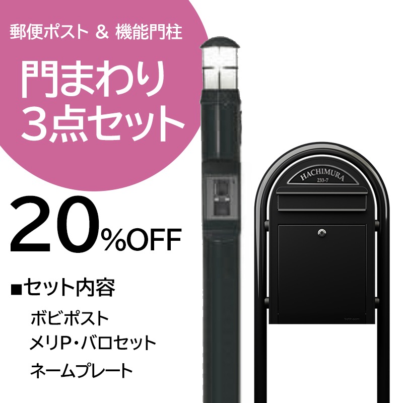 人気の門まわりアイテム3点がお得に揃うキャンペーンを実施中! 機能門柱&照明「メリピラリ&バロ」、郵便ポスト「ボビ」、ネームプレート「ベルクミラー」をセットで購入すると、なんと20%オフ。門まわりが一気に揃うお得なチャンスです。 このお得なキャンペーンは、2026年3月31日納品分までとなります。この機会をお見逃しなく!