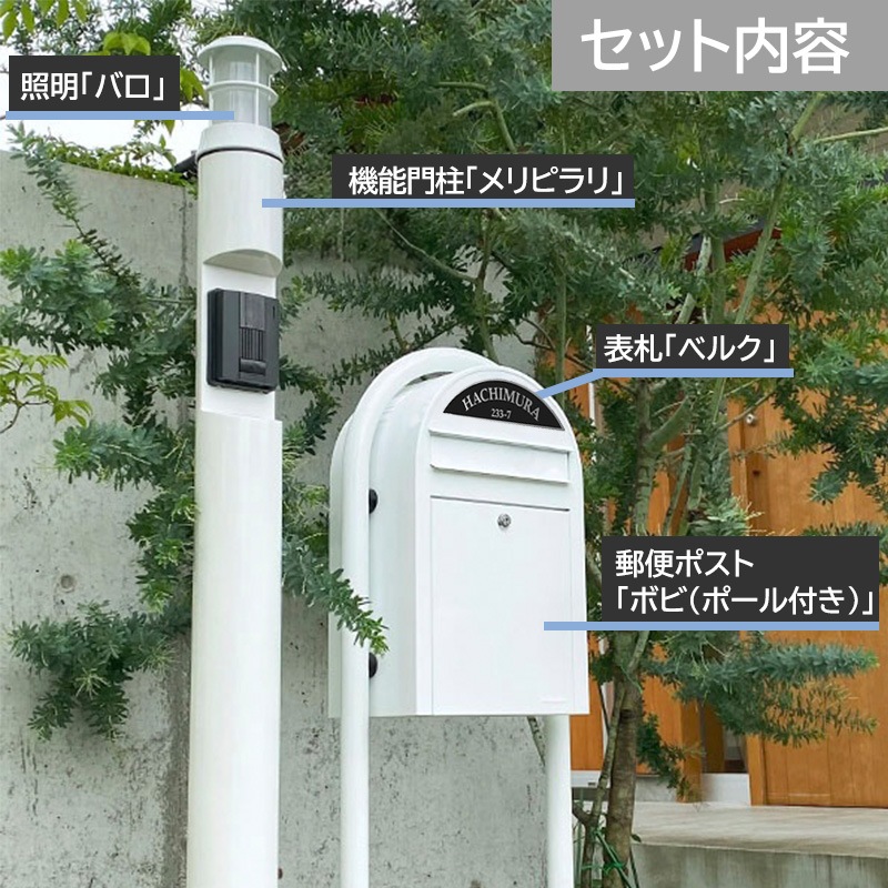 ●機能門柱「メリピラリ」●照明「バロ」●郵便ポスト「ボビ」+ボビ付属ポール「ボビラウンド」、●ネームプレート「ベルクミラー」