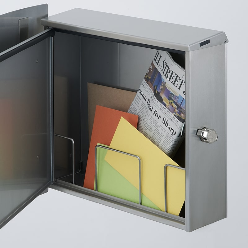 ツマミを90度回転させると扉が開きます。郵便物を取り出す際に、鍵を持ち歩く必要はございません。 また、お客様ご用意になりますが、レバー錠には、上下に貫通する穴が空いています。その穴に南京錠を通すことで、南京錠による施錠も可能になります。常時ではなく、長期不在時やご必要なときにだけ南京錠を使用することで、一時的ですが、防犯面を高めることが可能です。南京錠をご購入の際は、ジャフトの系がΦ6.5~7.0mmの少し太めのものをご用意ください。
