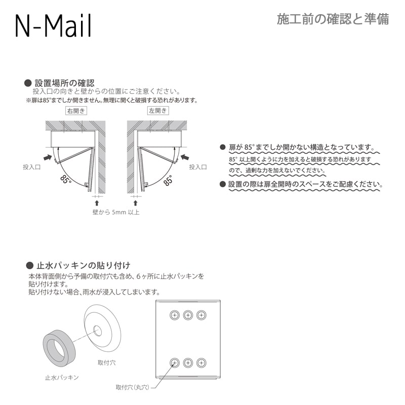 N-Mailは開き勝手が選べます。正面向かって右側に丁番があるタイプが右勝手。左兆番は左勝手です。勝手が選べることによって設置場所の可能性が広がり設計者さまにとっても施主様おすすめしやすい郵便ポストになっています。