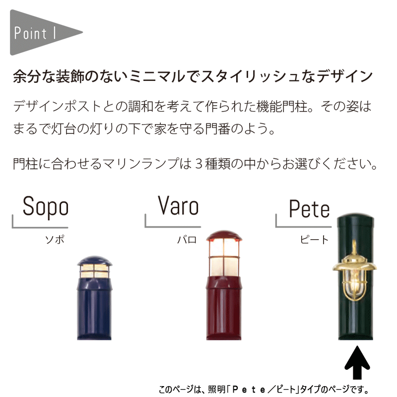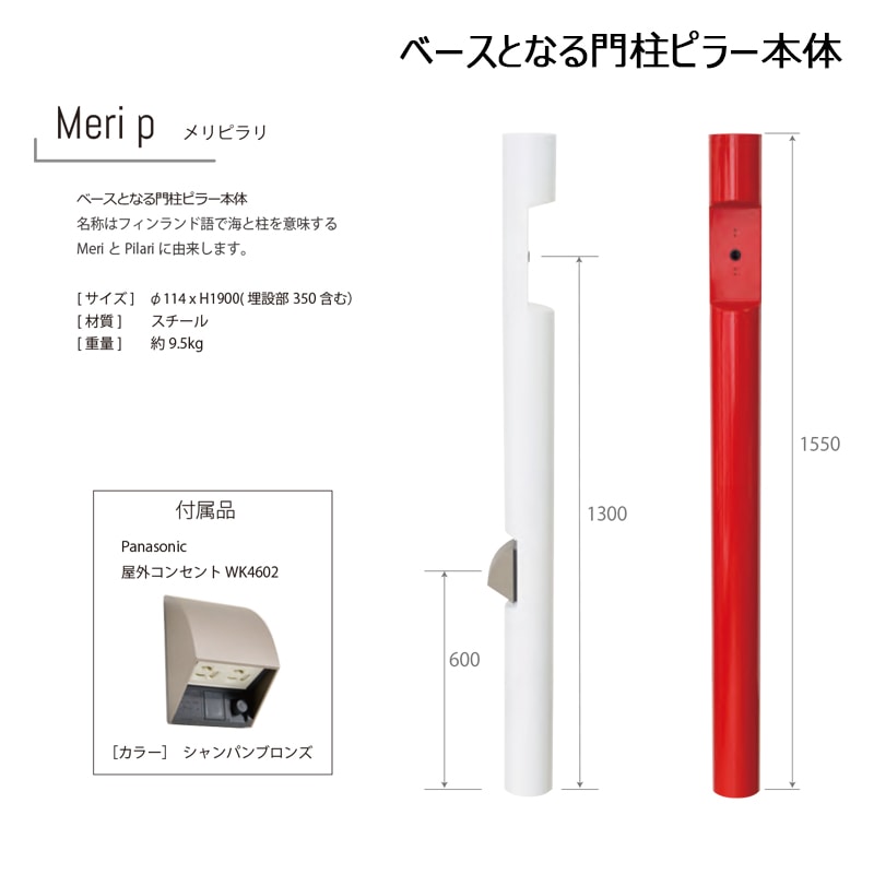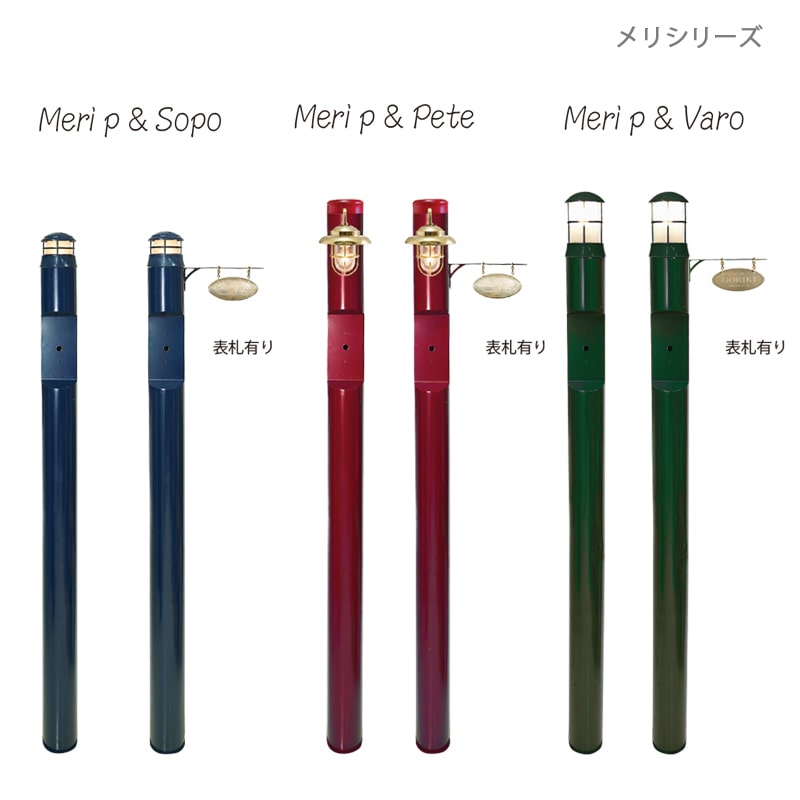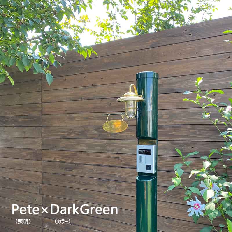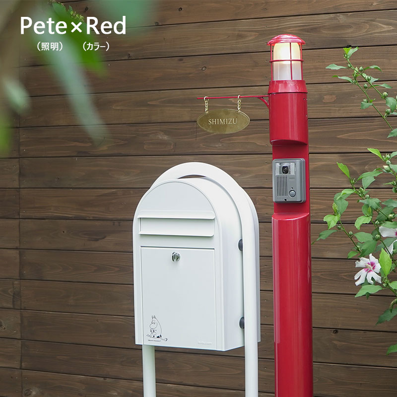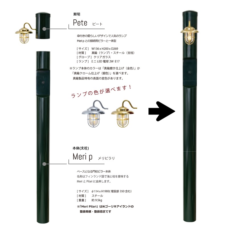 北欧の海バルト海に立つ灯台をイメージして作られたおしゃれな機能門柱 Meri series 。カラーバリエーションも豊富で選ぶ楽しみがいっぱいな人気のコーディネート門柱です。こちらは傘付きのあいらしいデザインの照明「Pete(ピート)」をセッティング。