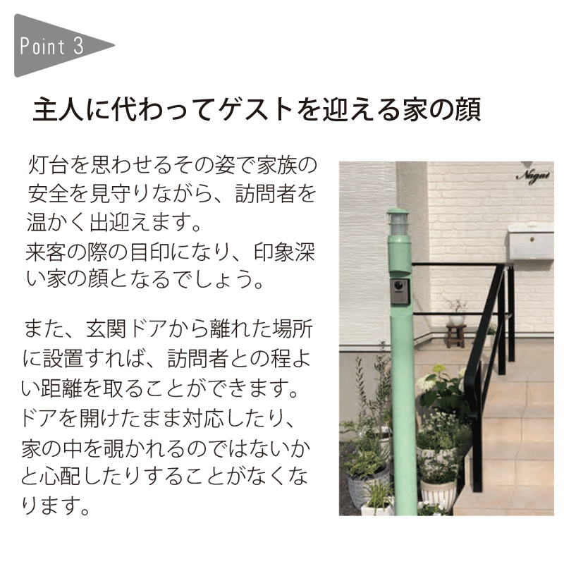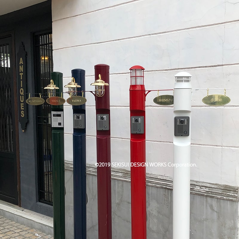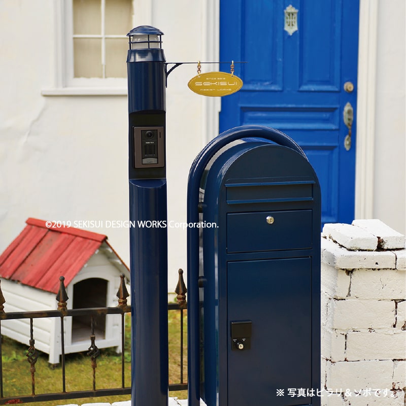 シンプルな円柱には、マリンランプらいしインダストリアルな構造を持ちながら、柔らかなフォルムのデザインが特徴のゴーリキアイランド社の真鍮製のマリンランプが取り付けられています。デザインポストとの組み合わせに最適な機能門柱です。北欧フィンランドで愛されている郵便ポストbobiとの相性の良い丸い柱(ピラー)を軸に、真鍮製のマリンランプを添えています。背面には屋外用コンセントも装備し、使いやすさと美しいデザインを両立しております。門柱にインターホンを付ける事ができるので、ドアから離れた場所に設置する事で、訪問者との程よい距離を保つ事が出来ます。オプションで表札の設置も可能です。