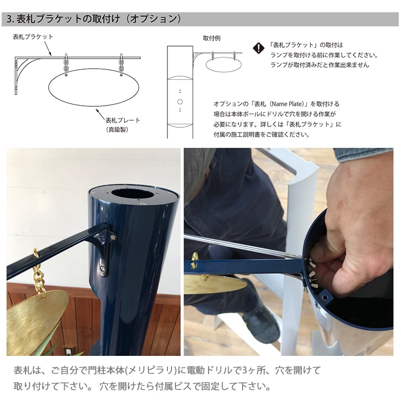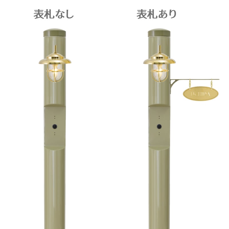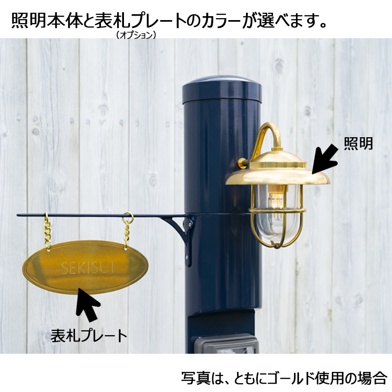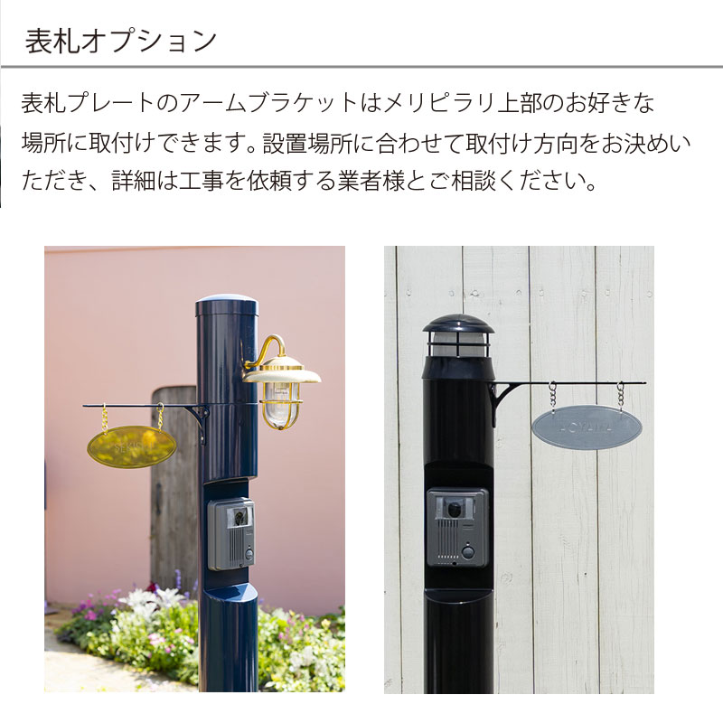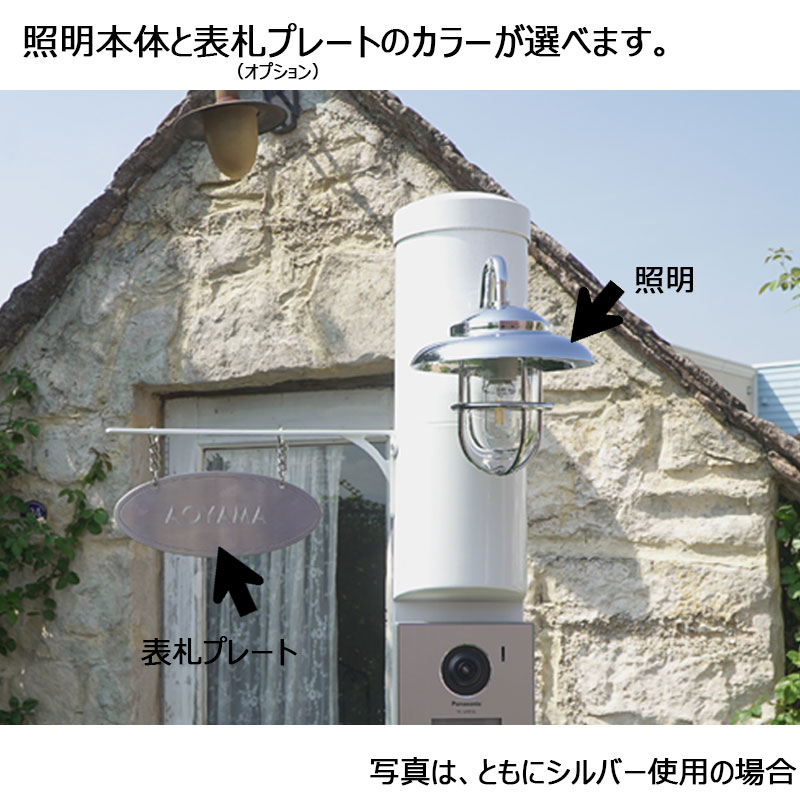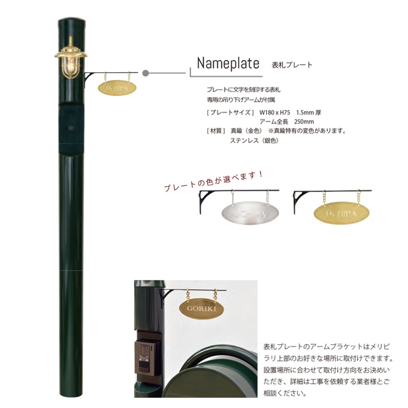 【材 質】 支柱(スチール)、照明(真鍮製/グローブ:ガラス)、オプション表札 (真鍮)