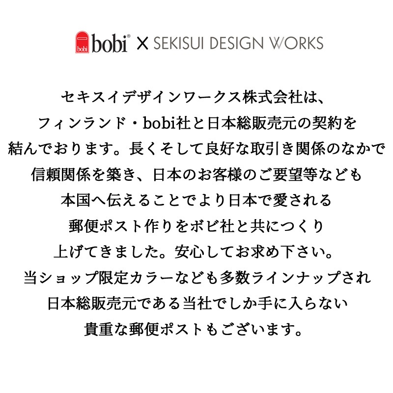 セキスイデザインワークス株式会社は、フィンランド・bobi社と日本総販売元の契約を結んでおります。長くそして良好な取引き関係のなかで信頼関係を築き、日本のお客様のご要望等なども本国へ伝え、より日本で愛される郵便ポスト作りをボビ社と共につくり上げてきました。安心してお求め下さい。当ショップ限定カラーなども多数ラインナップされ日本総販売元である当社でしか手に入らない貴重な郵便ポストもございます