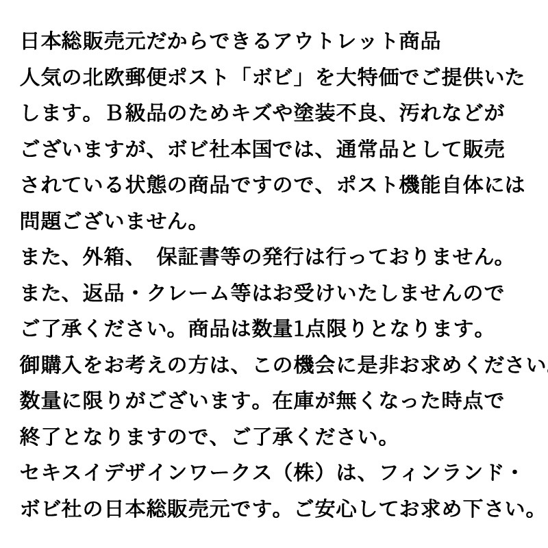 【注意事項】B級品のため、キズや塗装不良、汚れなどがございます。ボビ社本国では、通常品として販売されている状態の商品ですので、ポスト機能自体には問題ございません。また、外箱、 保証書等の発行は行っておりません。また、返品・クレーム等はお受けいたしませんのでご了承ください。商品は数量1点限りとなります。在庫が無くなった時点で終了となりますので、ご了承ください