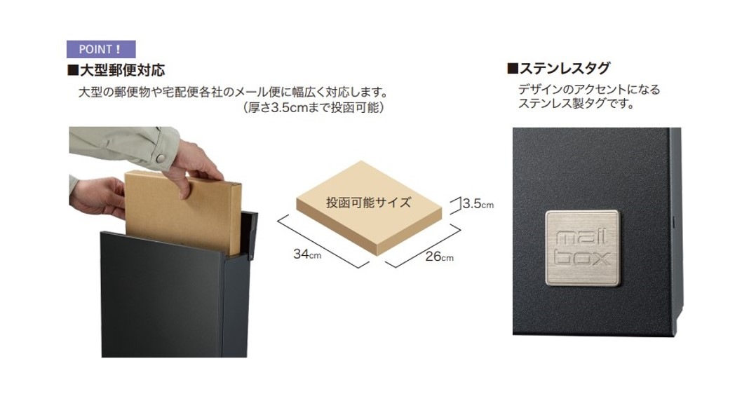 デザインと機能性を兼ね備えたSOL(大型郵便ポスト)は、周囲の環境と調和し、モダンな雰囲気を演出します。 大型の郵便物や宅配便各社のメール便に幅広く対応可能なので、いつでも大型郵便を受け取れる安心の大型郵便ポストです。