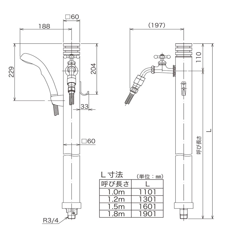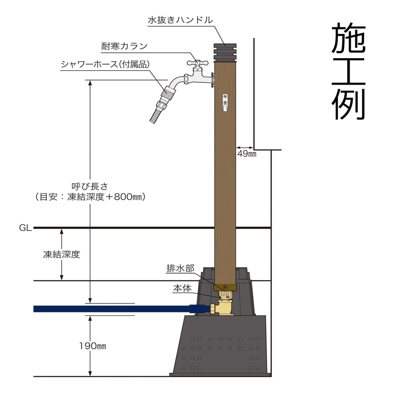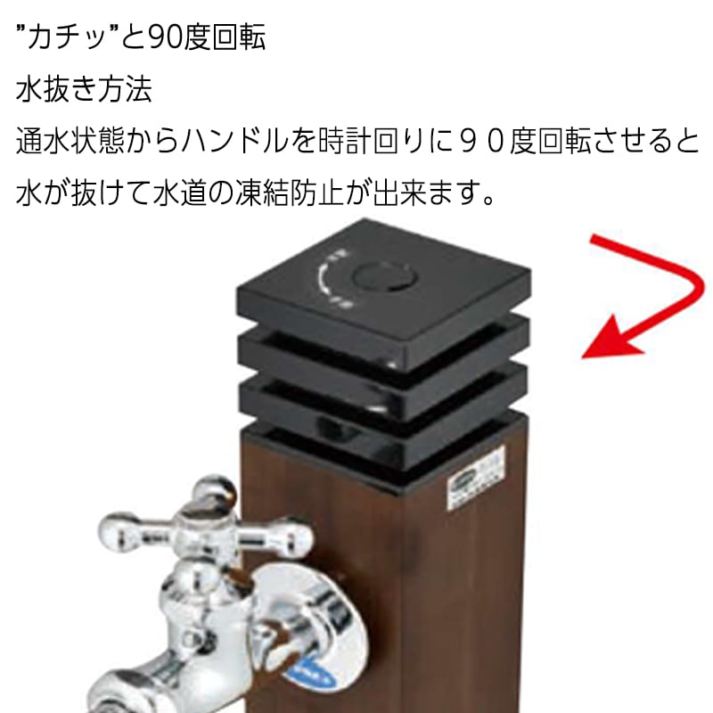ナチュラルな木目調と落ち着いたカラーで、外装になじむ不凍水洗柱。自然な見た目のキューブ型水抜きハンドルは、90度回転操作するだけで凍結防止が可能です。吸気機構により水抜きし忘れても安心。耐久性に優れたステンレス鋼管使用で長くお使いいただけます。※サイズによって金額は異なります。