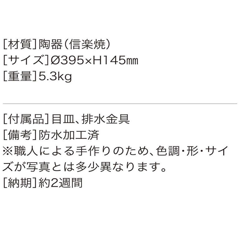 防水加工済み、冬場は水を溜めたままにされますと、凍結して割れる可能性もございます。ご注意ください。