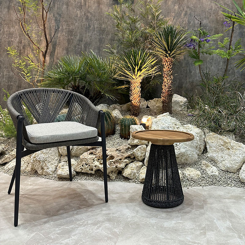 ミーティア サイドテーブルは、屋外での使用に最適な耐久性と洗練されたデザインが特徴です。軽量でありながら丈夫なアルミニウムフレームが安定感を提供し、側面に施されたポリプロピレンロープが軽やかなアクセントを添えています。天板にはチーク材を使用し、自然の温もりを感じさせる仕上がりとなっております。シンプルでありながらエレガントなデザインが、テラスやガーデンに美しく調和します。実用性と美しさを兼ね備えたこのサイドテーブルが、屋外でのくつろぎのひとときをより快適に演出してくれることでしょう。。