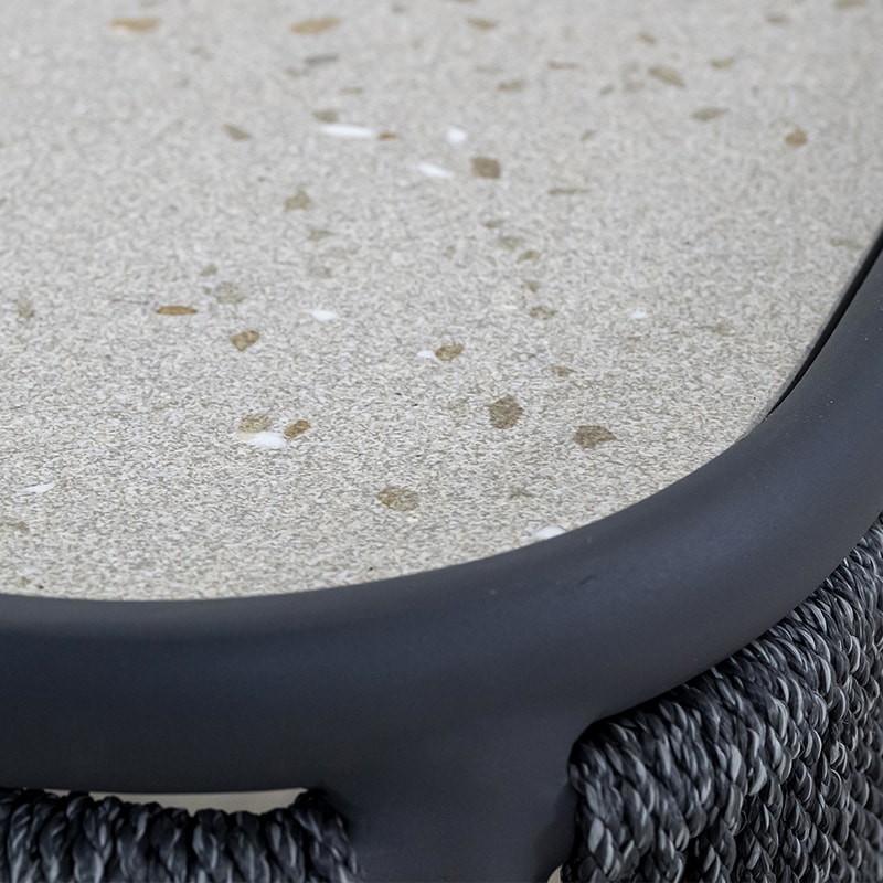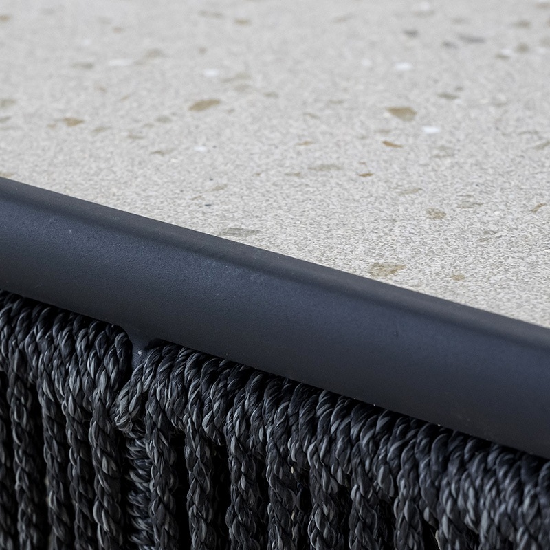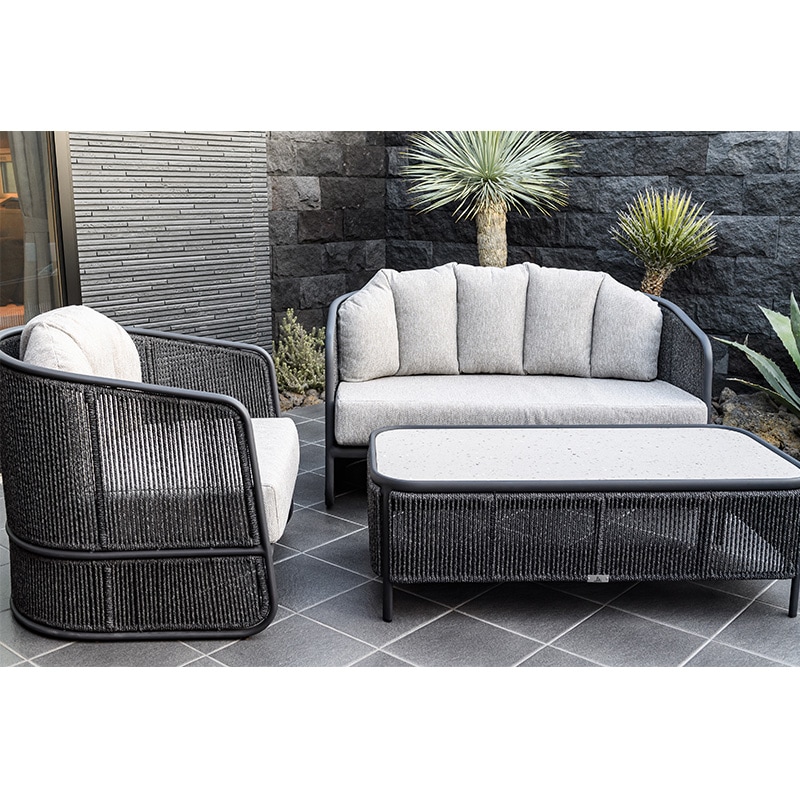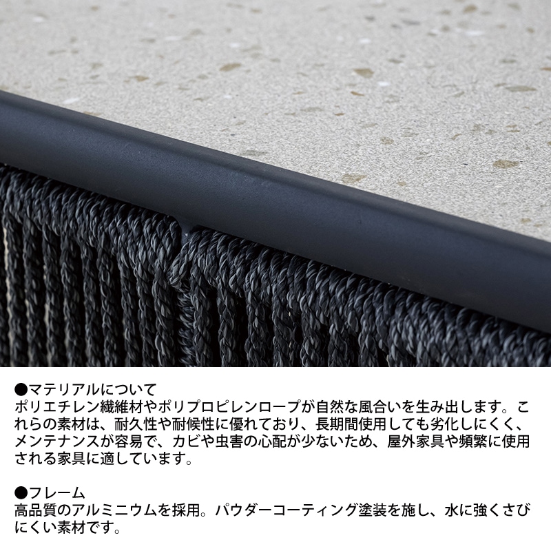 シンプルで洗練されたデザインが魅力のコーヒーテーブルです。ブラックフレームと編み込まれたロープの装飾が、モダンで落ち着いた雰囲気を演出します。天板には高品質な素材を使用しており、耐久性と実用性を兼ね備えています。