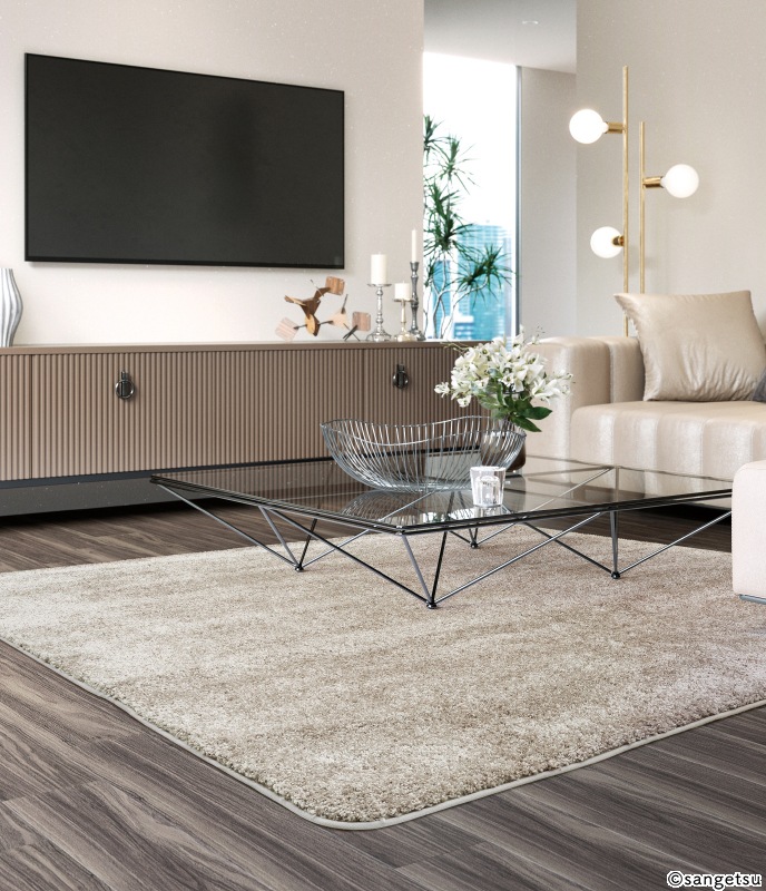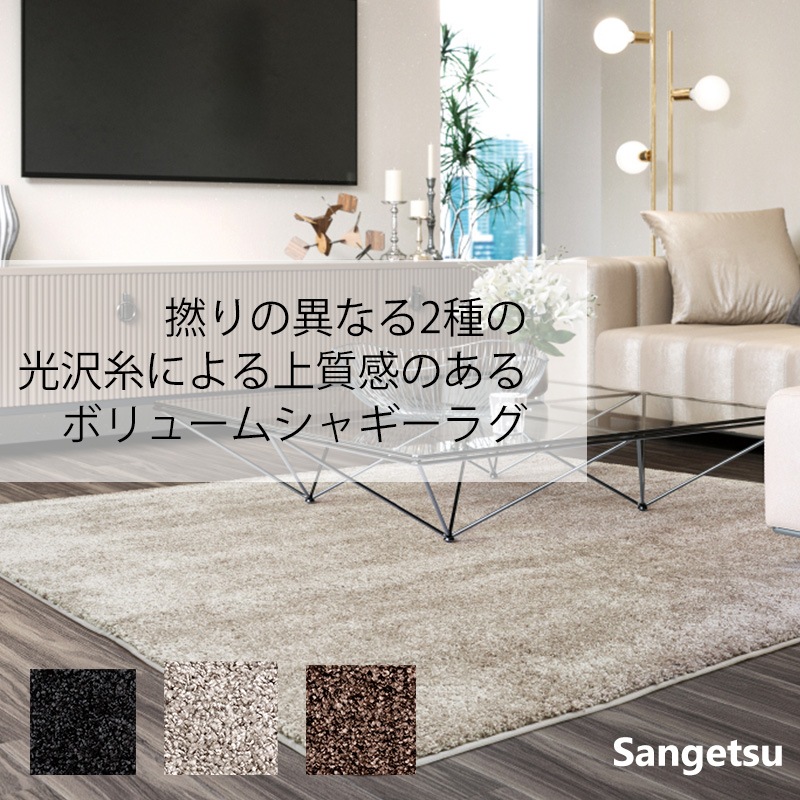 撚りの異なる2種の光沢糸による上質感のあるボリュームシャギーラグ。