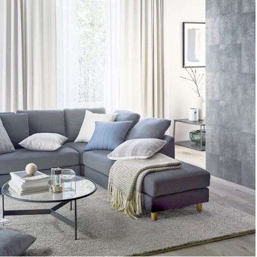 ダークグレーのソファ+ガラステーブルで作るシンプルモダンスタイルや、ダークブラウンの木製家具に合わせたナチュラルモダンスタイルにおすすめです。