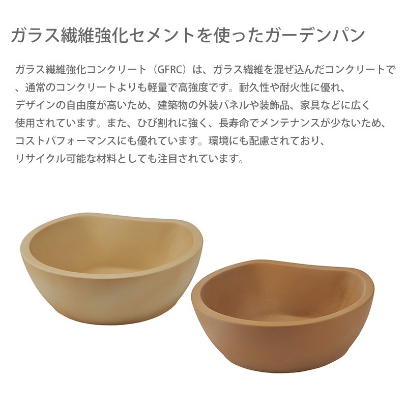 ガーデンパン「ポッシュ」は、ガーデニングを愛するあなたに最適な一品です。シンプルでナチュラルなデザインは、どんなアウトドアスペースにも美しく調和します。素焼風な見た目がありながら、耐久性のあるガラス繊維強化セメントを使用しているため、長くご愛用いただけます。