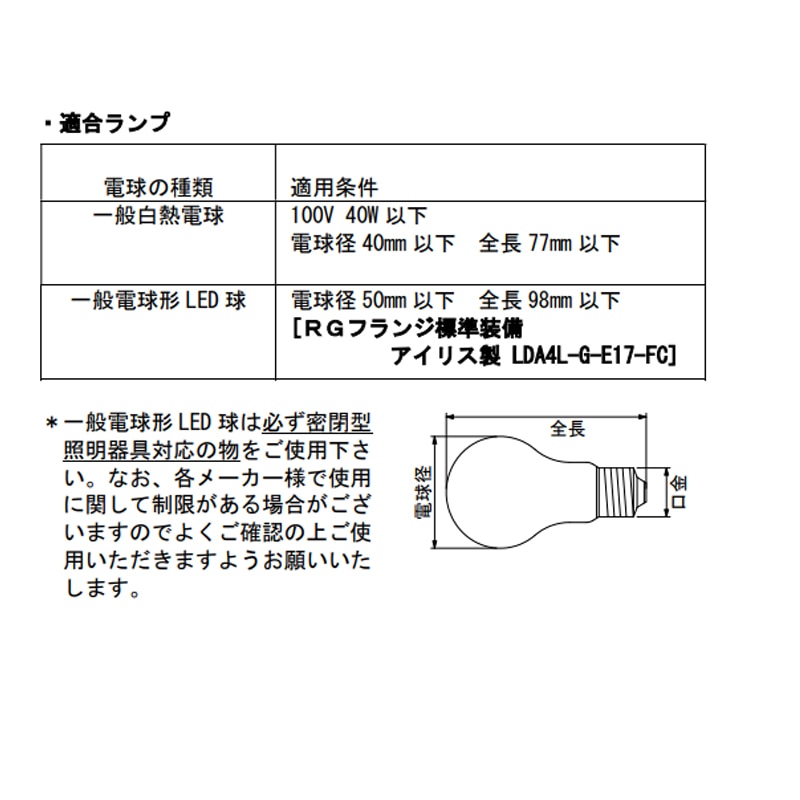 白熱電球:最大40W 電球径40mm以下 全長77mm以下