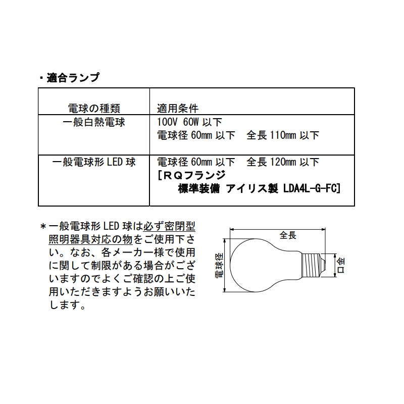 白熱電球:最大60W 電球径60mm以下 全長110mm以下